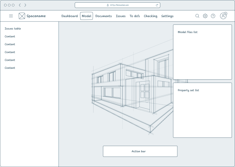 The initial wireframes for the MVP focused on core functionalities: simple model file upload and view, core navigation functionality and basic property viewing.